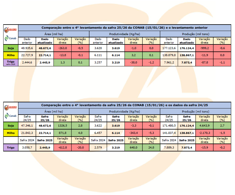 A Conab divulgou hoje seu 4° levantamento da safra 25/26 do Brasil, apontando a safra de soja em 176,12 milhões TM, um corte de 999 mil TM frente ao levantamento de dezembro.